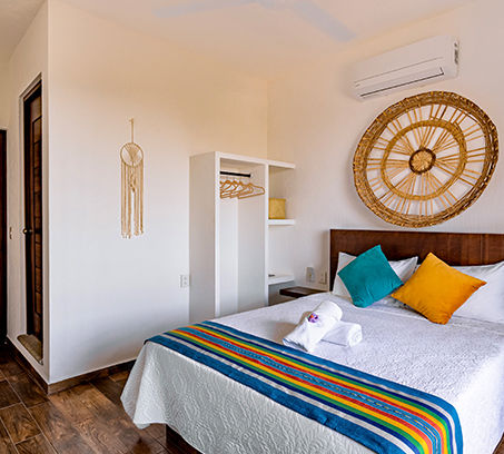 Comfortable single room with double bed, the boho decoration creates an atmosphere of modernity and good taste, the balcony has a view of the beautiful turquoise sea of Zicatela. All rooms are cool due to the type of floor used, in addition to having air conditioning. All our stays have light breakfast included. We have a safe deposit box for your greater confidence.